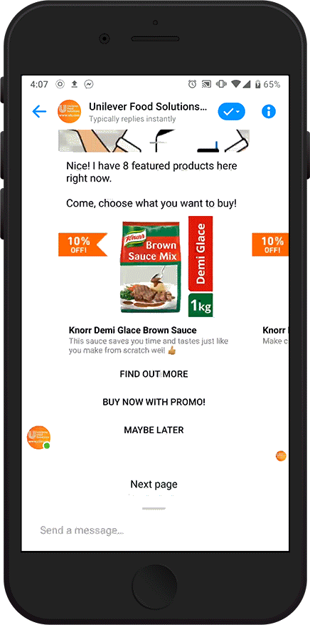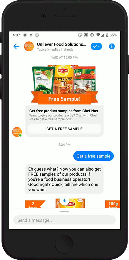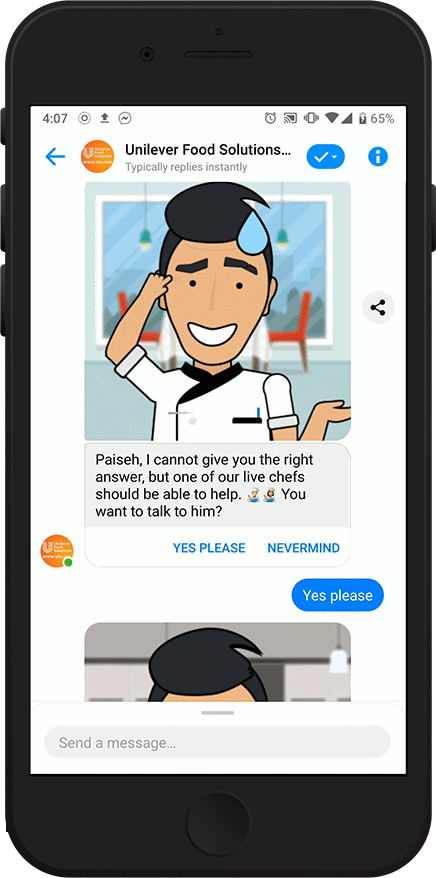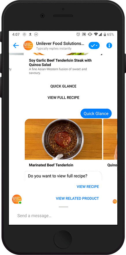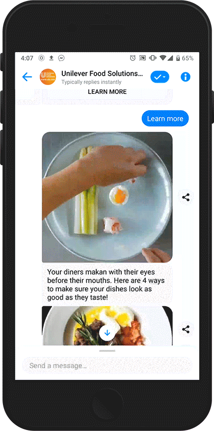 Chef Nas is a Facebook Messenger-based chatbot that chefs can interact with to find inspiration during their short breaks at work. With over 1.3 billion smartphone users in APAC—76% of whom use messaging apps—using a chatbot enables a seamless experience and reduces barriers to conversions, recipe discovery and product knowledge.