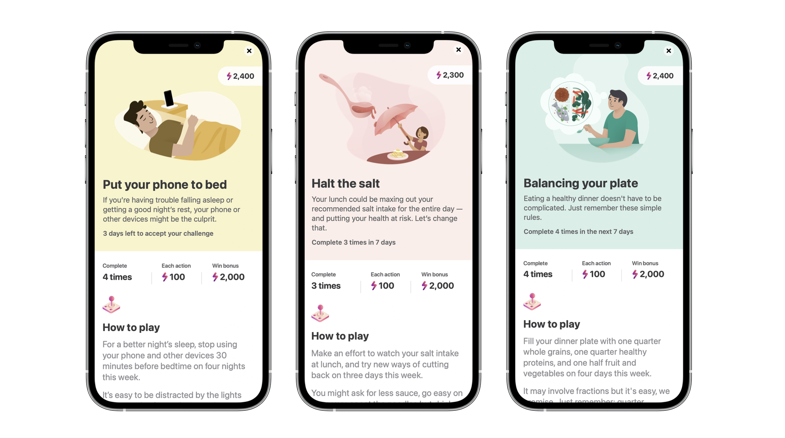 Based on each user’s needs and activity level, LumiHealth customises easy challenges that require just a little effort each day to complete. These challenges range from exercise and activity goals to quizzes and even logging habit changes such as reducing salt and eating right.